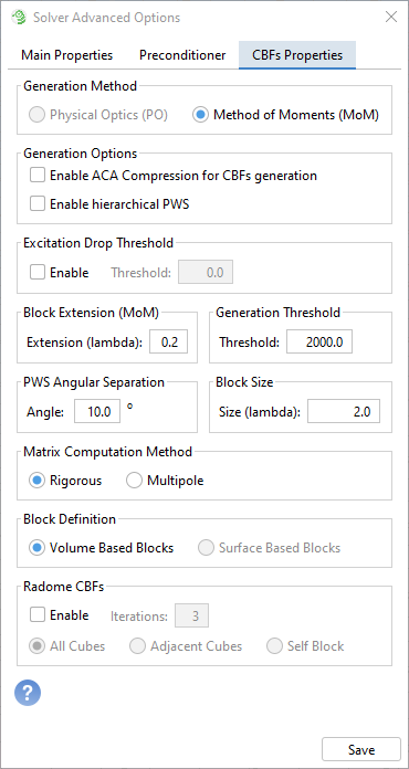When Macro Basis Functions (CBFs Radome) option is enabled in the panel Solver Functions in the Solver menu, the following options are available as well: