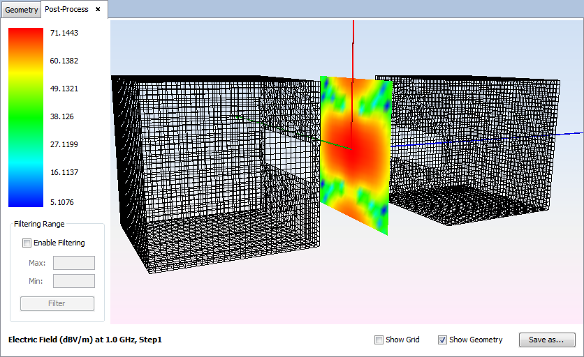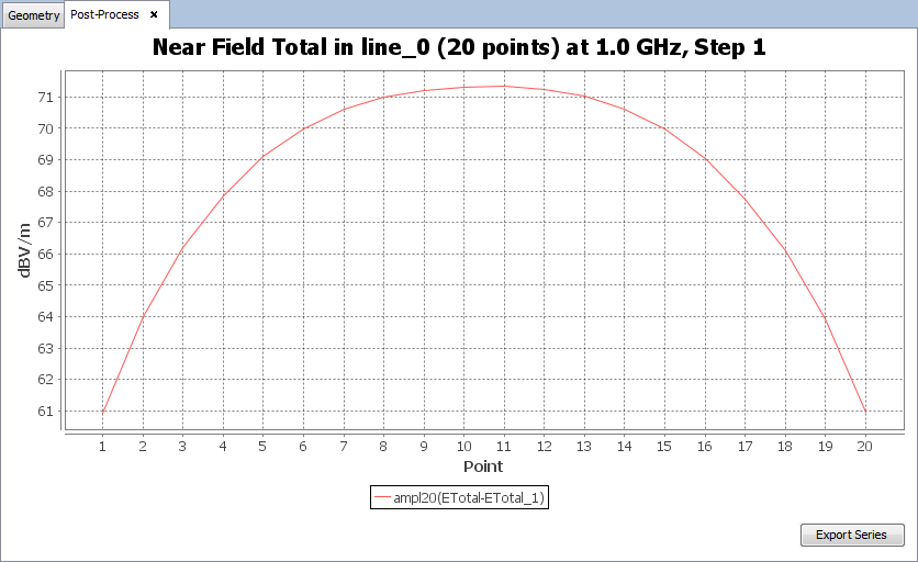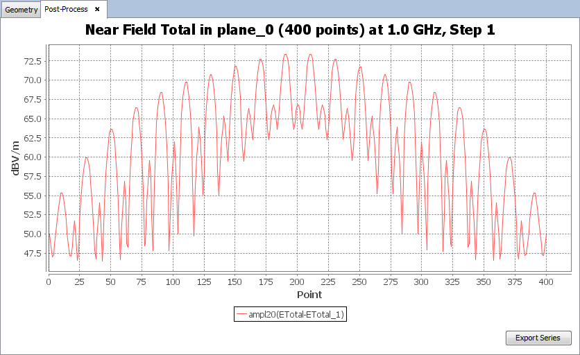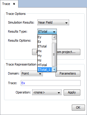 Select 'Show Results --> Post-Process' option to calculate the field difference on the plane observation between this example (slotted boxes) and the example executed on the first part of this guide (closed boxes). To see the result as a plot, select 'plot' on the selector of 'New Trace' option and click on 'OK' button.