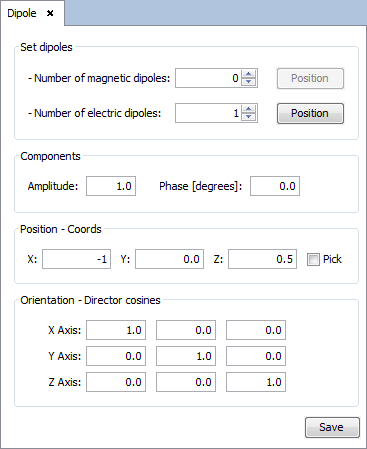 Select 'Antenna --> Dipole Antenna' option and set the parameters as show the next figure. Then save the parameters and the antenna appears.