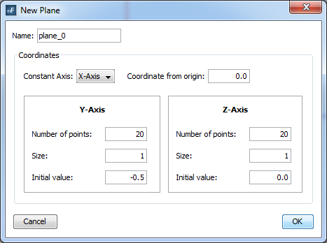 To add a plane visualization, select 'plane' on the selector of 'Geometry Types' section and click on 'Add' button. The plane parameters panel will appear, then configure the values as the next figure show and accept it clicking on 'OK' button.