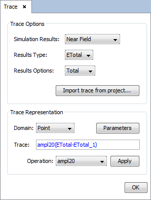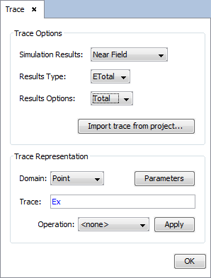 To import the result of the other project, first select the result to show on 'Simulation results', 'Results Type' and 'Results Options' combo boxes. In this case, the values of the next figure for 'Trace options' panel.
