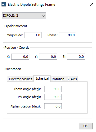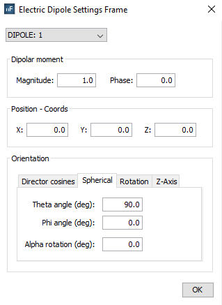 Select 'Source --> Dipole --> Dipole Antenna' option and set the parameters as show the next figure. Then save the parameters and the dipole appears.