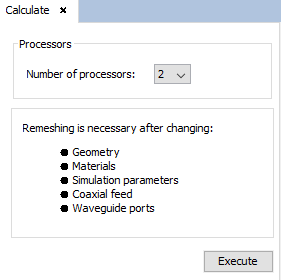 Select 'Calculate --> Execute' option to open simulation parameters. Then select the number of processors as the next figure show. In order to obtain the shortest possible time for calculating the results, it is recommended to run the process with the number of physical processors available to the machine.
