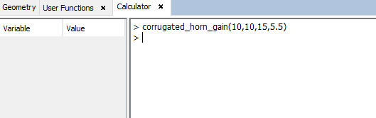 Execute the function “corrugated_horn_gain(fmin,fmax,alfa,D)". To execute the function, click on Tools - Calculator and write the call to the function.