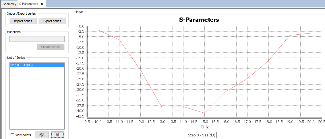 When the simulation process has finished, the S-Parameters are enabled within the results menu. Click on Show Results menu and S-Parameters option to visualize these parameters. The panel with the available options to visualize the S-Parameters is open on the right side.