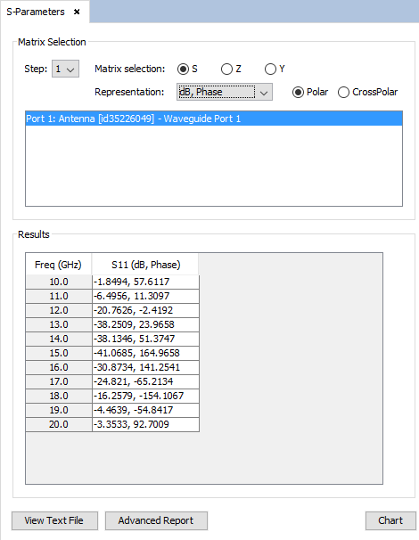 Select the S-Matrix Representation and the option db, Phase in Representation section. Then, select the column to represent in the Results table and then click on Chart button to add them to plot them.