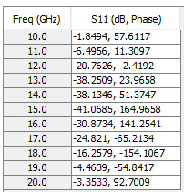 Figure 11. S11 parameters table