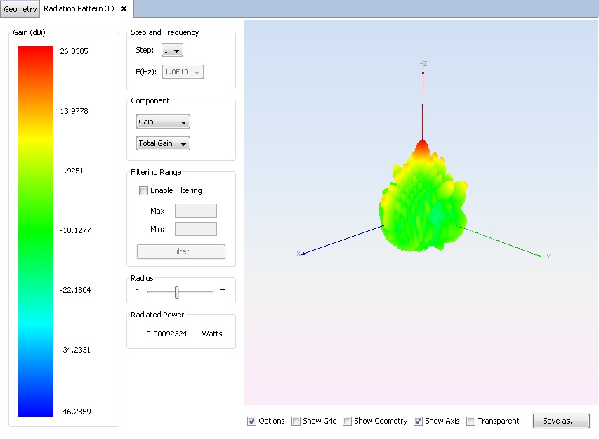 Select ' Show Results --> Radiation Pattern --> View 3D Pattern' option to show the radiation diagram in three dimensions.