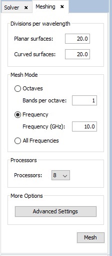 Select ' Meshing --> Parameters' to open the meshing configuration panel and then set the parameters as show the next figure. In order to obtain the shortest possible time for meshing, it is recommended to run the process of meshing with the number of physical processors available to the machine. As it is a very complicated design requires 20 divisions in the mesh and a high computing capacity