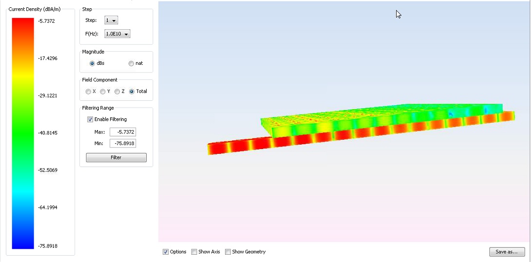 Select ' Show Results --> View Currents ' option to show the current density on the surfaces of the array.