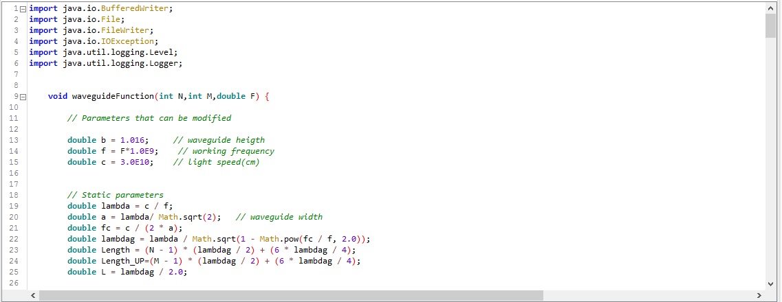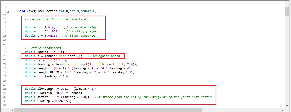 In our case, as we want a 12-slot feeding waveguide, N= 12, M=11 and F is the working frequency value in GHz.
