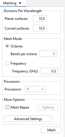 - Divisions per wavelength: The user may specify different mesh density in planar and curved surfaces. Planar surfaces are contained in a single plane, otherwise surfaces are curved. Let c be the speed of light in the vacuum (meters per second), given a number of divisions D and a frequency f, the size of the generated elements L is given by: