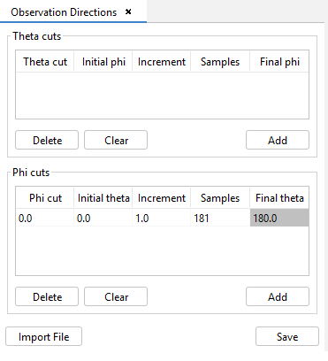 In order to make the calculations useful, the user should configure observation directions where the electrical field will be calculated. These directions will be selectable by the user after the calculations have been done when inspecting the results. To add a cut, either a theta or a phi cut, press the Add button to add a row to the associated table, and fill the values in the row.