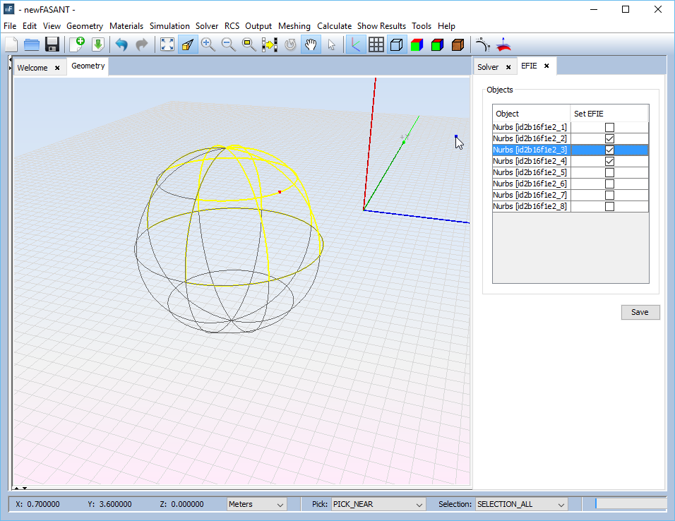 In order to use this tool, open this menu when the solver equation has been set to CFIE. A list with every object defined in the user interface, surfaces and objects, will be displayed in the EFIE Panel that will appear. Use the Set EFIE check box near every row to mark that object to be analyzed using EFIE equation. Press Save to save changes after every object has been selected.