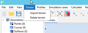 • Import terrain: Allows the user to import a terrain model into the project. Terrain models can be used for extracting the topographic profiles that will be used in simulation cases. The user can import terrain models with the GeoTiff or ARC/INFO ASCII GRID formats.