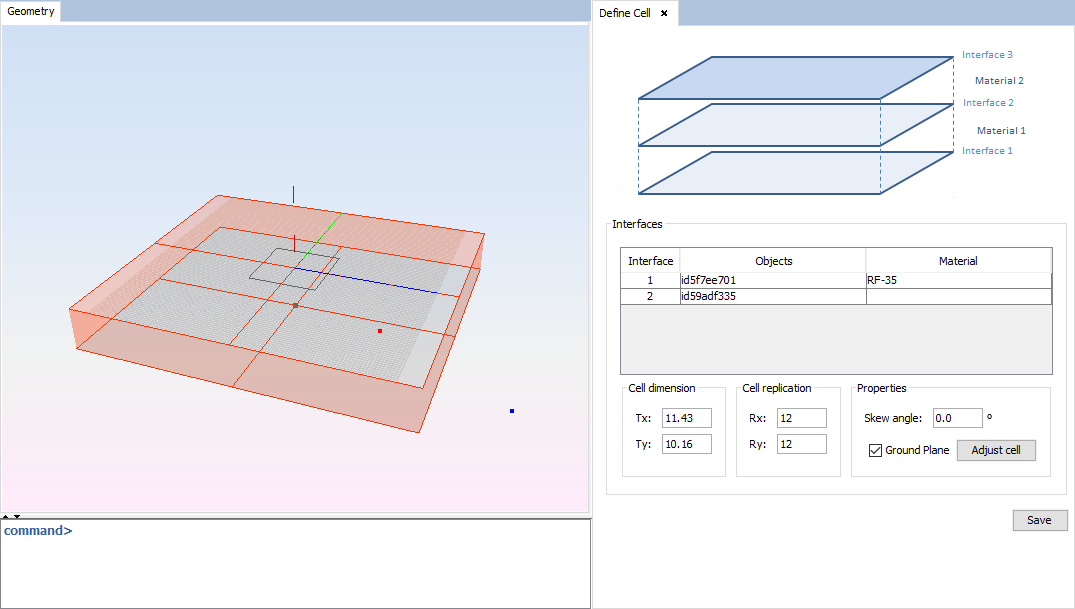 - In the table, each row means an interface with it object. The material column refers to the material of the layer above the interface, i.e. the layer between the interface indicate by the row and the next interface. This interfaces are ordered from the lowest Z order to the upper (that can´t has a material). For the material on interface 1 select ‘RF-35’ on the list (the material added on the previous step).