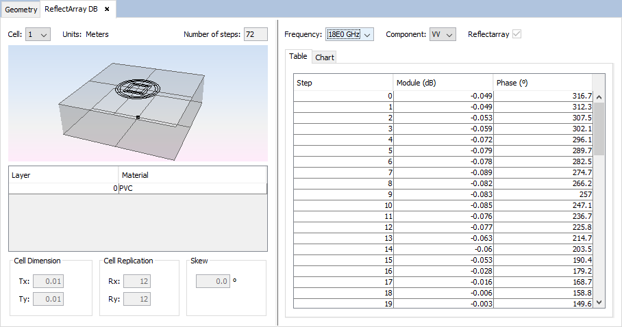 This command allow the user to represent all the information about the generated database, if it would be generated. The panel show information about the number of steps or different configurations of the cell, including the option to represent each one, the material layers, cell dimension and replication and if the cell has a skew angle. This panel show information about if the generated object is reflectarray or transmitarray and information about the phase values for a selected frequency of the computed frequencies and the desire component. The phase can be represented on a table of values or plot.