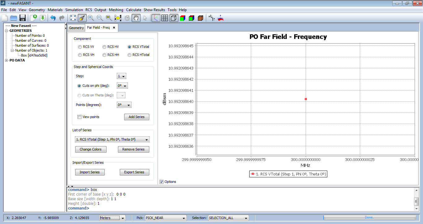 When initially open, the panel will display a default series in the plot that will represent the measurements for a particular component, step, and observation point in a phi or theta cut, against every possible frequency that has been simulated. More series can be added, by selecting component, step and spherical coordinates in the control panel that appears leftside to the plot.