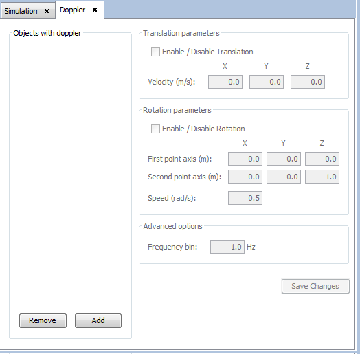 In this panel, we can add Doppler effect to objects in the geometry. To do this, select an object from the geometry view and press the Add button. The selected object will be added to the list of objects. It is possible to remove the Doppler effect from an object by selecting it from the list and pressing the Remove button.