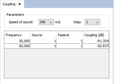 This option allows to visualize the coupling values for each source-receiver pair at each frequency, for a user-specified parametric step and speed of sound. The contents of the table will automatically reflect the changes in any of these parameters.