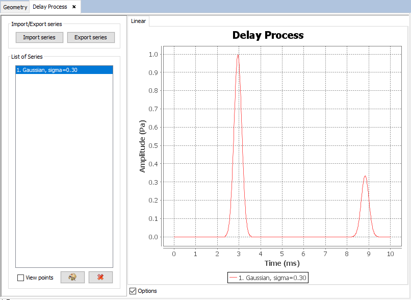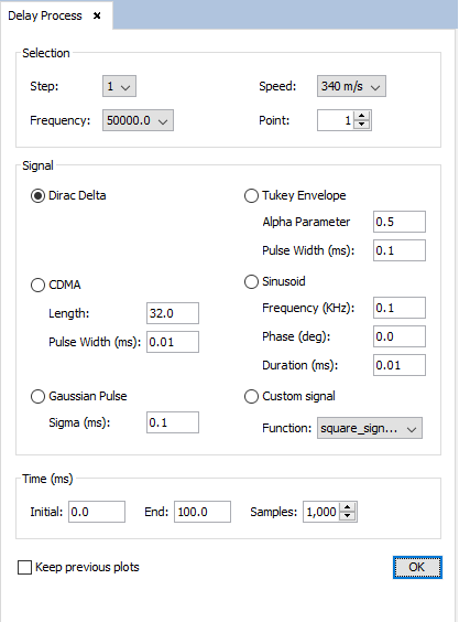 This option allows the user to visualize the Delay Process, that is, a visualization of the signal emitted by the ultrasound sources in the time domain, as it is received at an observation point. When the user selects this option, the following panel is shown: