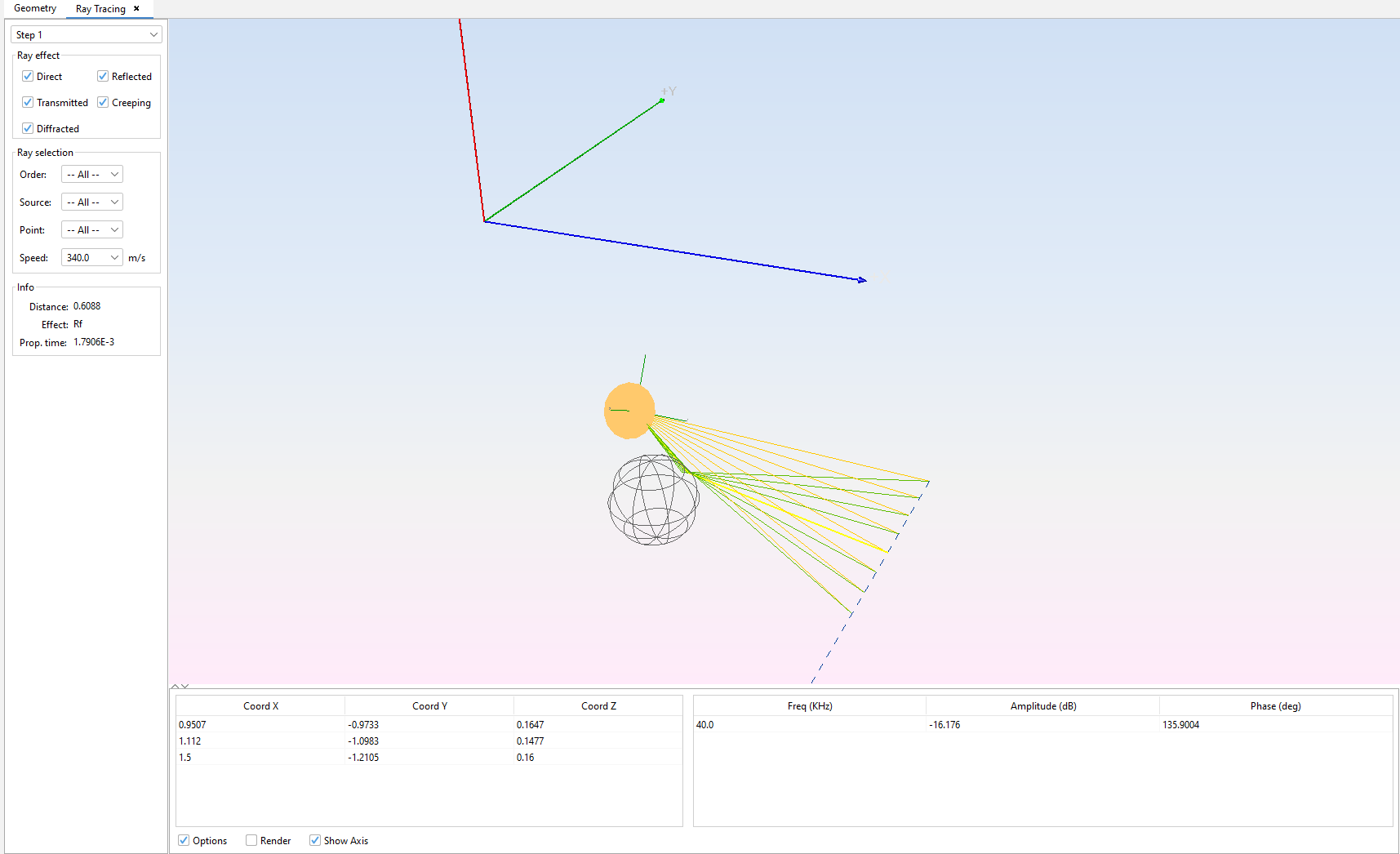 When open, the panel will display the rays for a particular step, order, source, observation point and speed. All the effects are selected by default. The possible configuration options are: