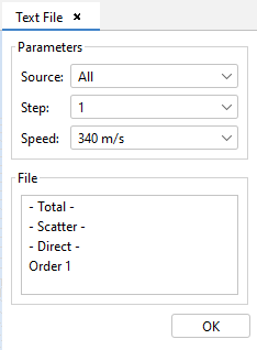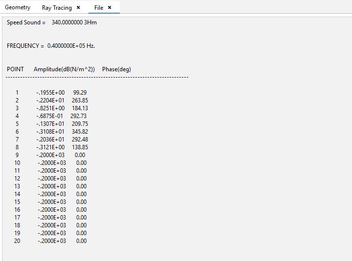 This option allows the user to visualize the values of the sound pressure field in text format. These results are shown for each frequency and observation point at a given parametric step. When the user selects the View Text Files option, the following panel will appear: