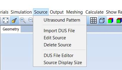 The "Source" menu contains the options needed to define the ultrasound sources of the simulation. The "Source" menu contains the following options:
