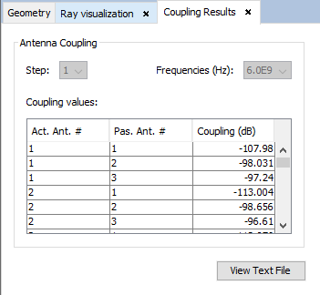 The coupling between the transmitter and the receptor antennas can be visualized by clicking Show Results – Coupling – Antenna Coupling.