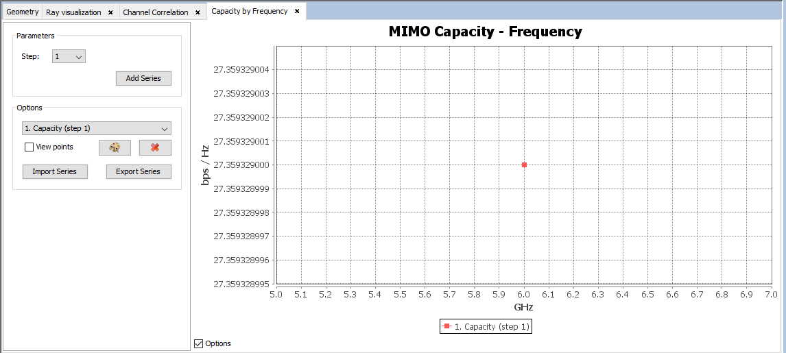 The capacity at the selected frequency can be visualized by clicking Show Results – MIMO Capacity – View Capacity by Frequency.