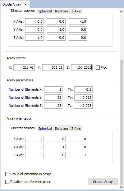 Click on Output – Coupling – Short Dipole and select the Antenna array option. Set the parameters as shown.