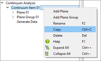 Planes and Plane Groups can be copied by right-clicking on the plane or plane group and selecting copy. This will copy the plane within the same continuum Item.