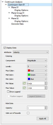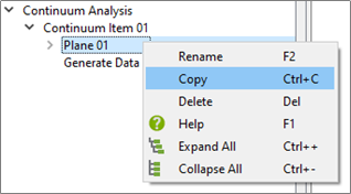 A continuum Item is used to create and define continuum planes, generate data and view the results. The user can add as many planes or plane groups as necessary for each continuum item. Multiple continuum Items can be added or copied.