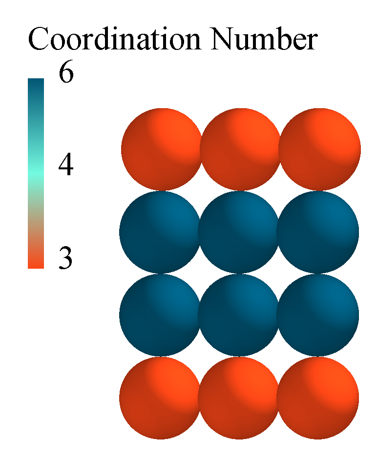 Below is an image of a 3-sphere particle shape. Four particles are placed on top of each other. The base and top particles have a coordination number of 3 as each particle is in contact with 3-spheres of the middle particles. The middle two particles have a coordination number of 6 as they are in contact with 3 spheres of the particle above and 3 spheres of the particle below.