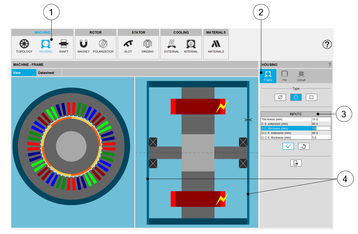 Frame / Housing design area – End caps and frame 1-2 Selection of the Housing subset: HOUSING panel. Settings of the frame and end caps dimensions 3 User inputs for defining the dimensions of the frame and end caps 4 The two end caps are considered separately from the frame and each of them can have its own dimensions - Frame and end caps – Materials