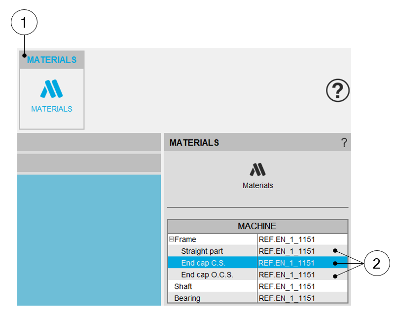 MATERIALS design area 1 Selection of the Material subset: MATERIALS panel (Click on the icon MATERIALS) 2 The two end caps are considered separately from the frame and each of them can have its own material - Internal cooling – New interface gaps