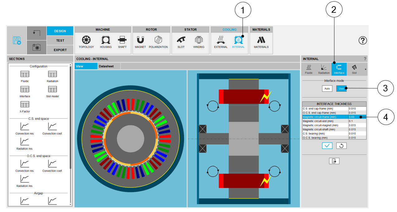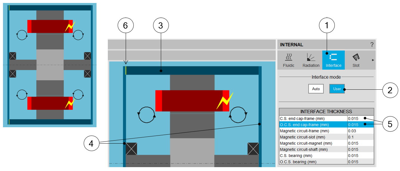 Interface design area – New interface thicknesses between frame and end caps 1 Internal cooling – Definition of the interface parameters 2 User mode to set the interface gaps manually. 3-4 Visualization of the Straight part of the frame and the two different end caps 5 Air gaps between the frame and the end caps can be set separately for both sides of the machine 6 The line which corresponds to the selected air gap to be defined is highlighted Interface thickness inside each bearings