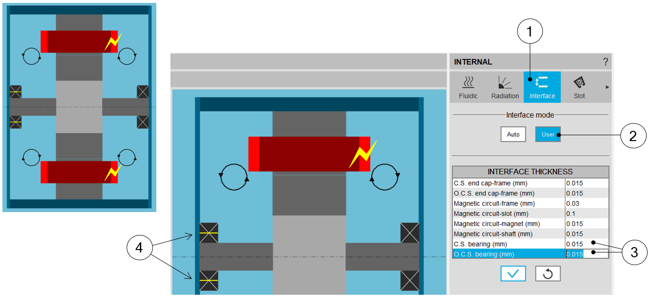 2 Selection of the section “Interface” in which all the imperfect contacts between the different components of the machine can be set. 3 The user mode can be selected to define the interface thickness manually. 4 A list of interface thickness (imperfect contacts) is available. In this list new interface gaps have been added.