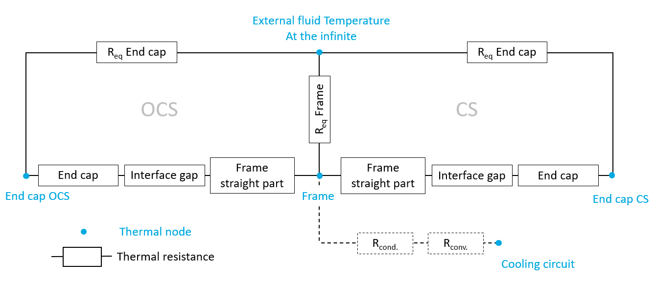 The global resistance between the frame, the end caps and the external fluid is illustrated in the thermal resistance network shown below.