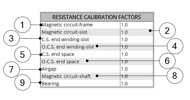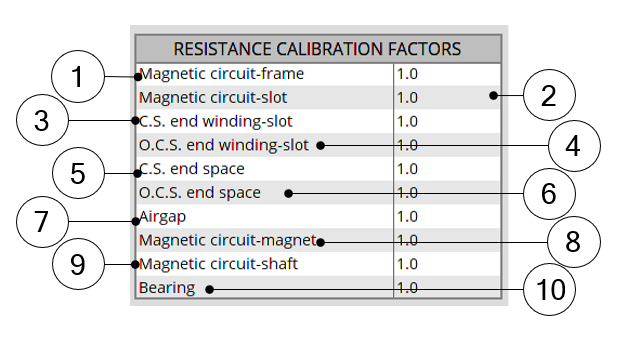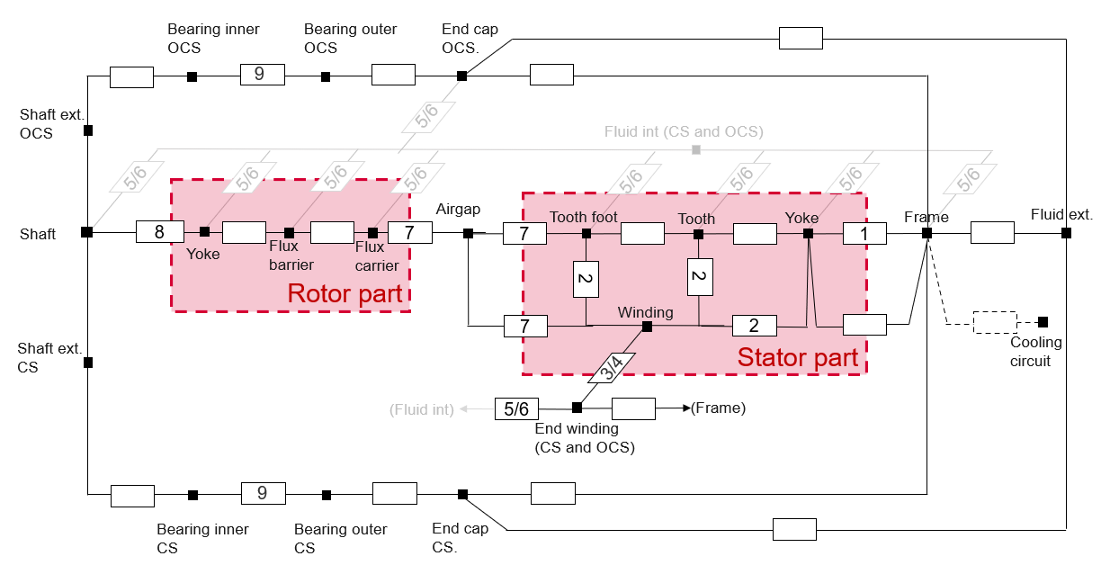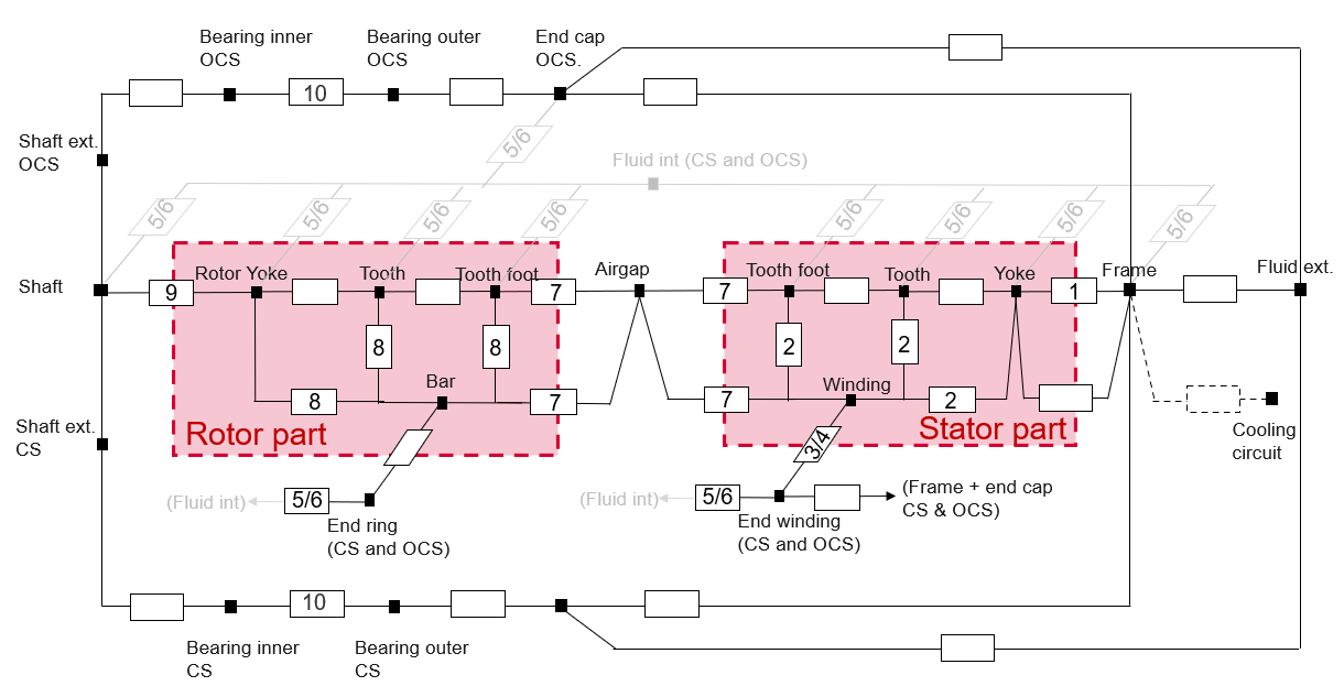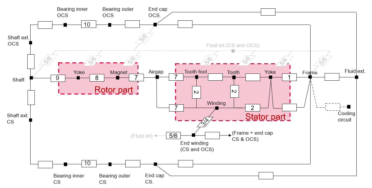 The following picture gives an example of a simple thermal circuit, including the main resistances corresponding to the default synchronous magnet machine, where the frame, the two end caps, the shaft and the bearings have been added.