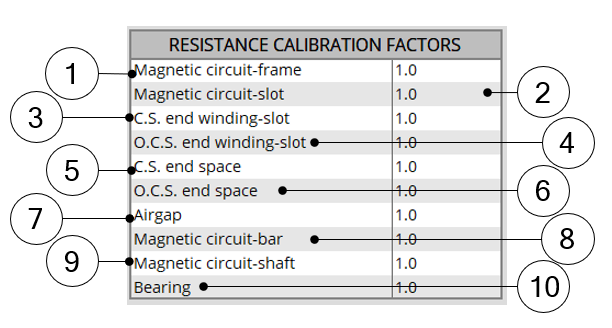 Interface design area – Interface thicknesses for bearings 1 Internal cooling – Definition of the interface parameters 2 User mode to set the interface gaps manually. 3 Air gaps to be set for both bearings at the Connection Side and at the Opposite Connection Side 4 The line which corresponds to the selected air gap to be defined is highlighted - Thermal resistance network – Frame, end caps and the external