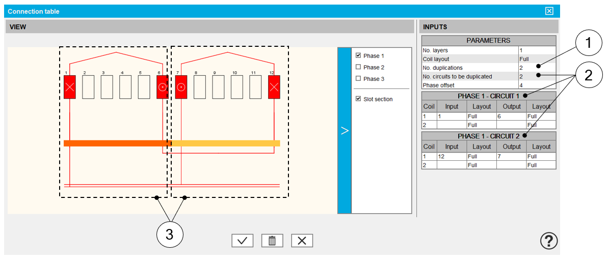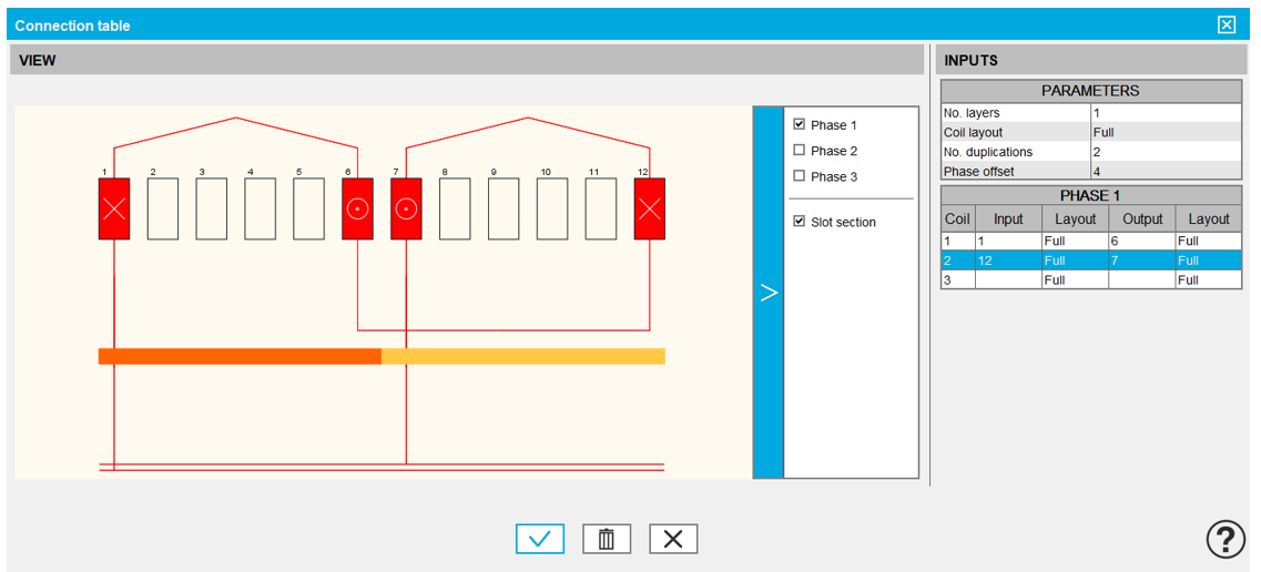 Dialog box for defining the connection table while using the expert mode Input and output of each coil must be defined. In that case 2 duplications are considered which means that only half of the winding must be defined.