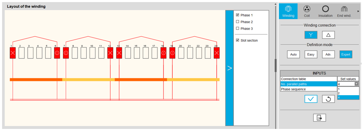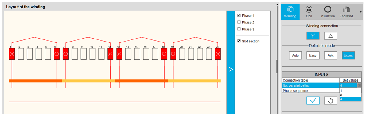 In the previous versions, while using the expert mode for designing the winding architecture, the user set the connection table by considering the number of duplications. A drop-down menu gave the possible choices of duplications based on the number of slots and poles.