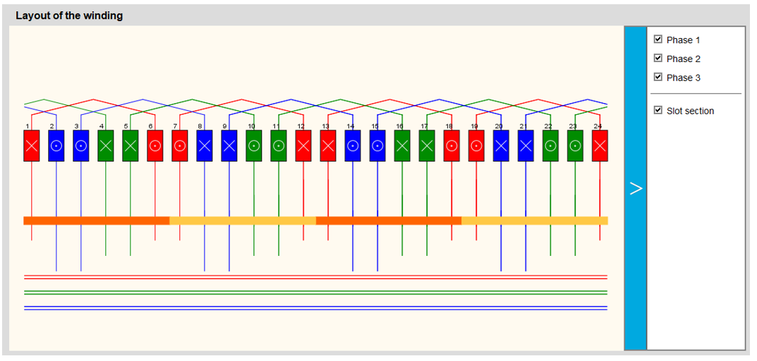 Layout of the resulting winding architecture Warning: Concerning, the motors built with previous version and for which the winding was initially defined with the expert mode, when these will get opened with the new version (2022.1), the user input « No. circuits to be duplicated » will be set automatically to 1 and only one parallel circuit is considered.Important:This modification is a problem for motors with a number of parallel paths « No. parallel paths » which is greater to the number of duplications « No. duplications » .