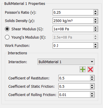 Enter the Poisson's Ratio, Shear Modulus (or Young's Modulus), Solids Density and Work Function (if applicable) into the relevant fields.