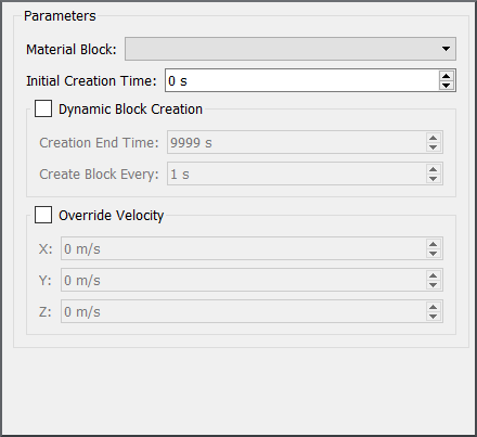 This option allows the user to create a bed of material in the selected geometry. Due to its functionality, the tool is only available for Box geometries. To use select the material box and Right Click to choose Add Block factory. The following Parameters are then shown: