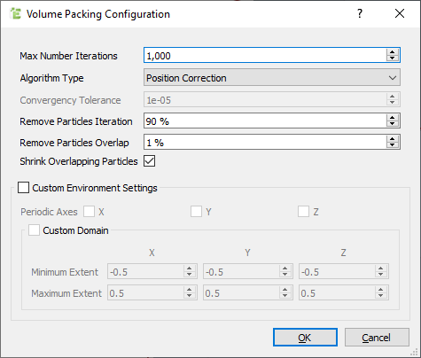 The Volume Packing tool is used to fill a geometry with particles based on a user defined solid fraction. The process of achieving this is to generate the required number of particles to satisfy the solid fraction and then iteratively rearrange the particles to remove overlaps between the overlapped particles and particles overlapping the geometry. There are two different methods available for the volume packing tool. The first one (recommended), is based on calculating particle displacement based on the average distance to neighboring particles. The second one is an optimization algorithm that calculates the displacement by solving an optimization function based on the total distance to particle neighbors and geometry.