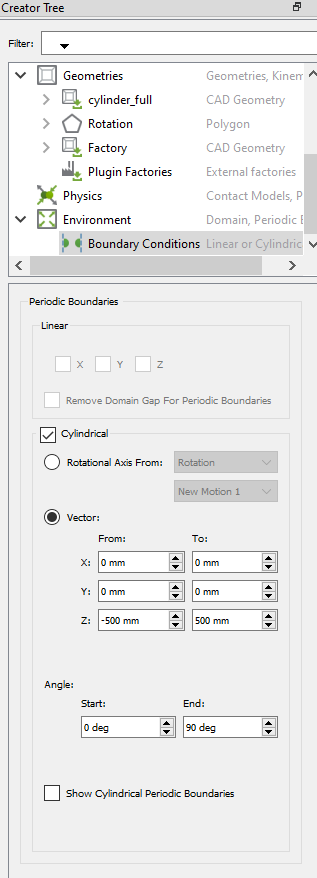 A cylindrical periodic boundary can be defined using the axis from a rotational kinematic or a vector based on a start or end point.