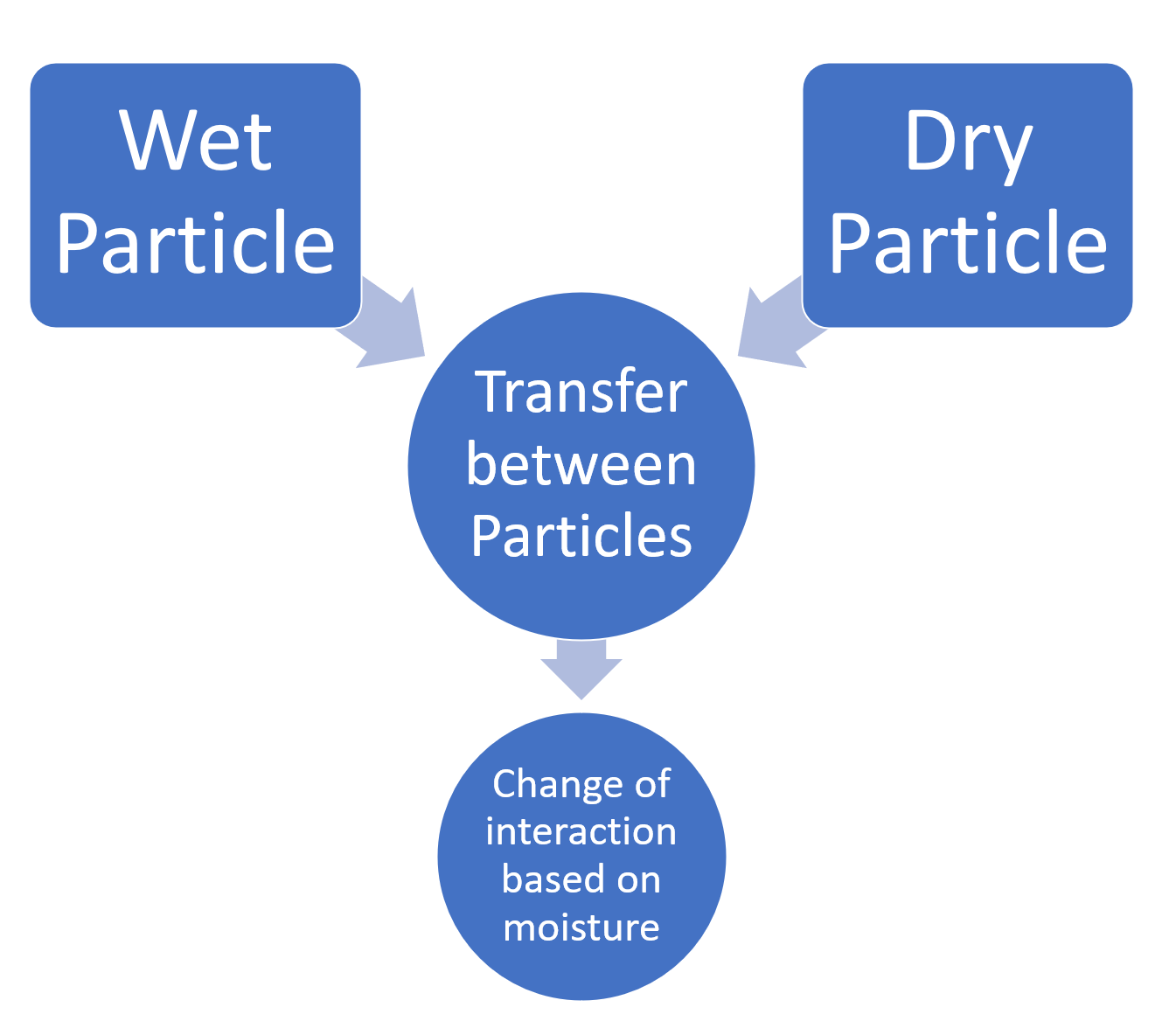 The wet mixing model allows particles with a moisture content (defined in the factory settings) to be added to a simulation. This moisture can be transferred to drier particles while mixing. The level of moisture in the model alters the interaction behavior of the particles. This model is aimed at cement applications. As this model is experimental feedback would be appreciated.