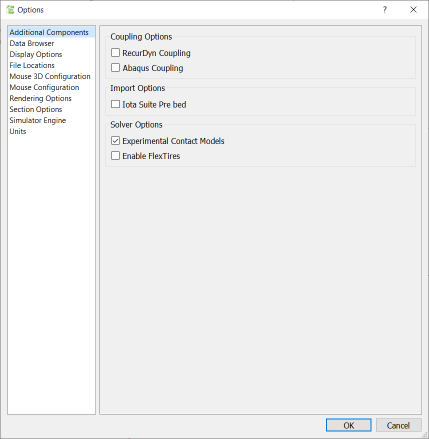 The Volume Spring Model is made available in the Options Menu>Additional Components>Experimental Contact Models. Once enabled Volume Spring will appear in the Contact Model Chain (experimental contact models are highlighted in green).